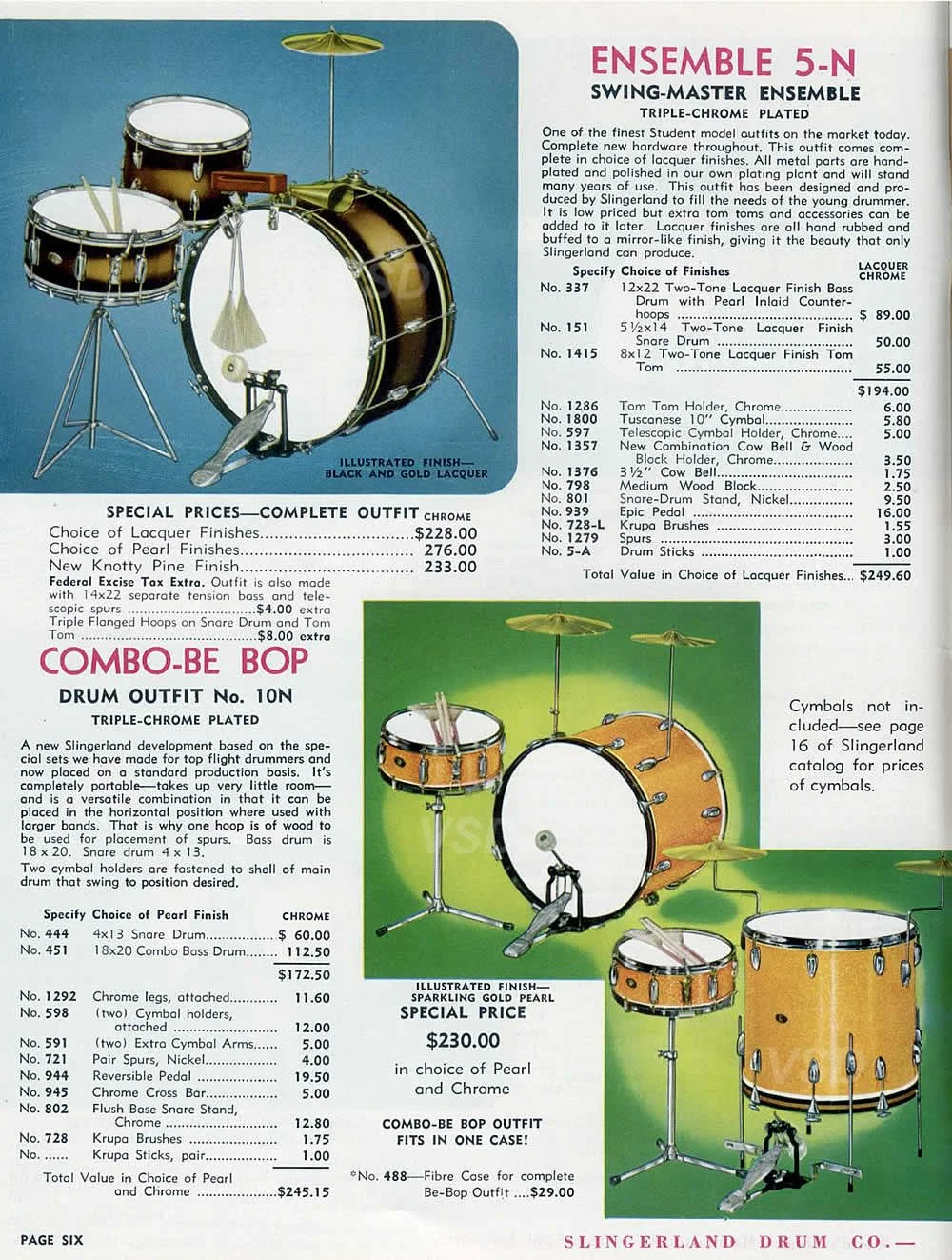 Catalog image from 1959. Snare drum looks to have been part of the 2-piece 'Combo-Be Bop' configuration which consisted of 20x18" kick and 13x4" snare so I’ve always known these as the ‘Bop’ model, but this isn’t fully official.