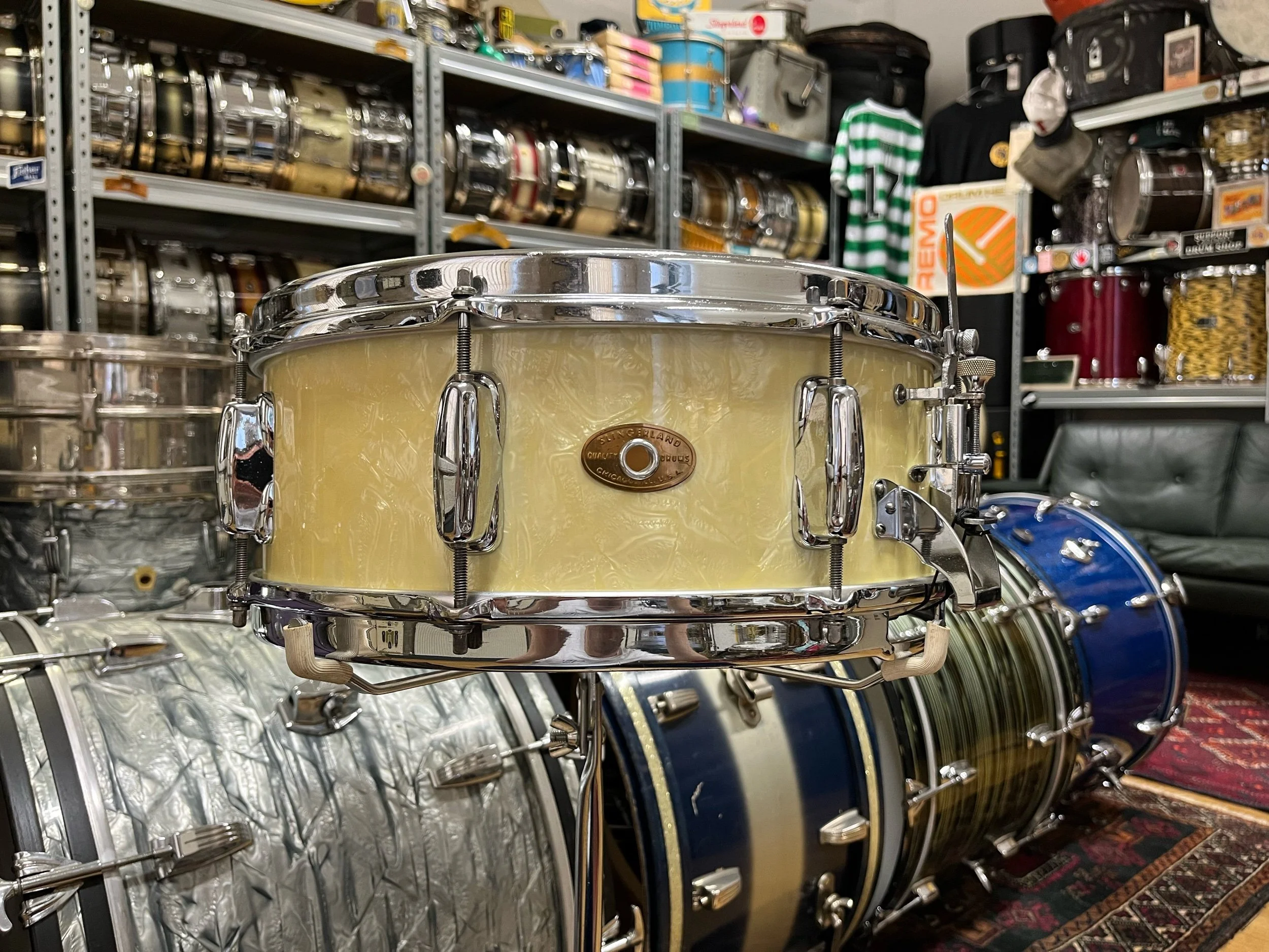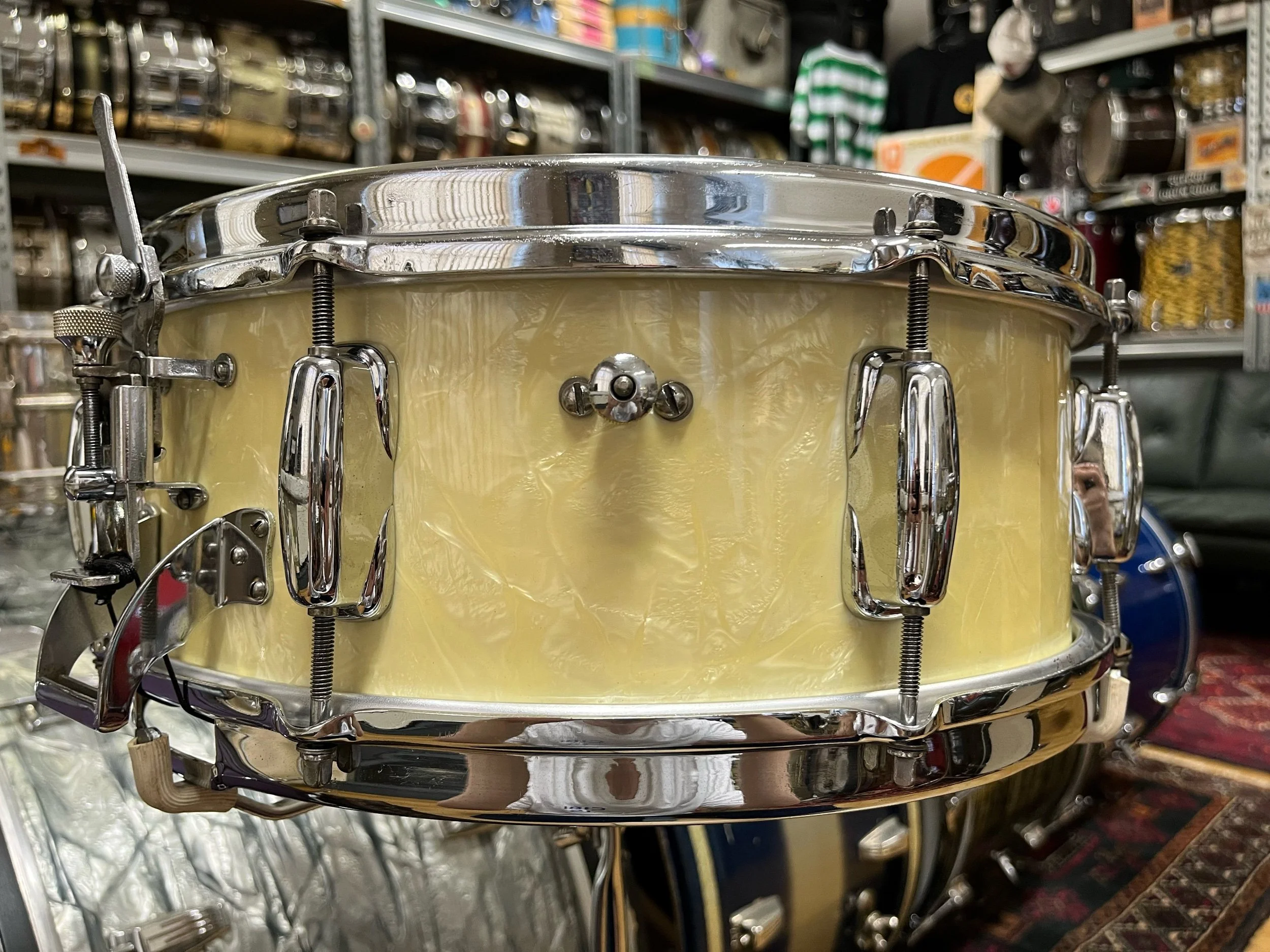The drum is finished in original white marine pearl which has mellowed beautifully over time.