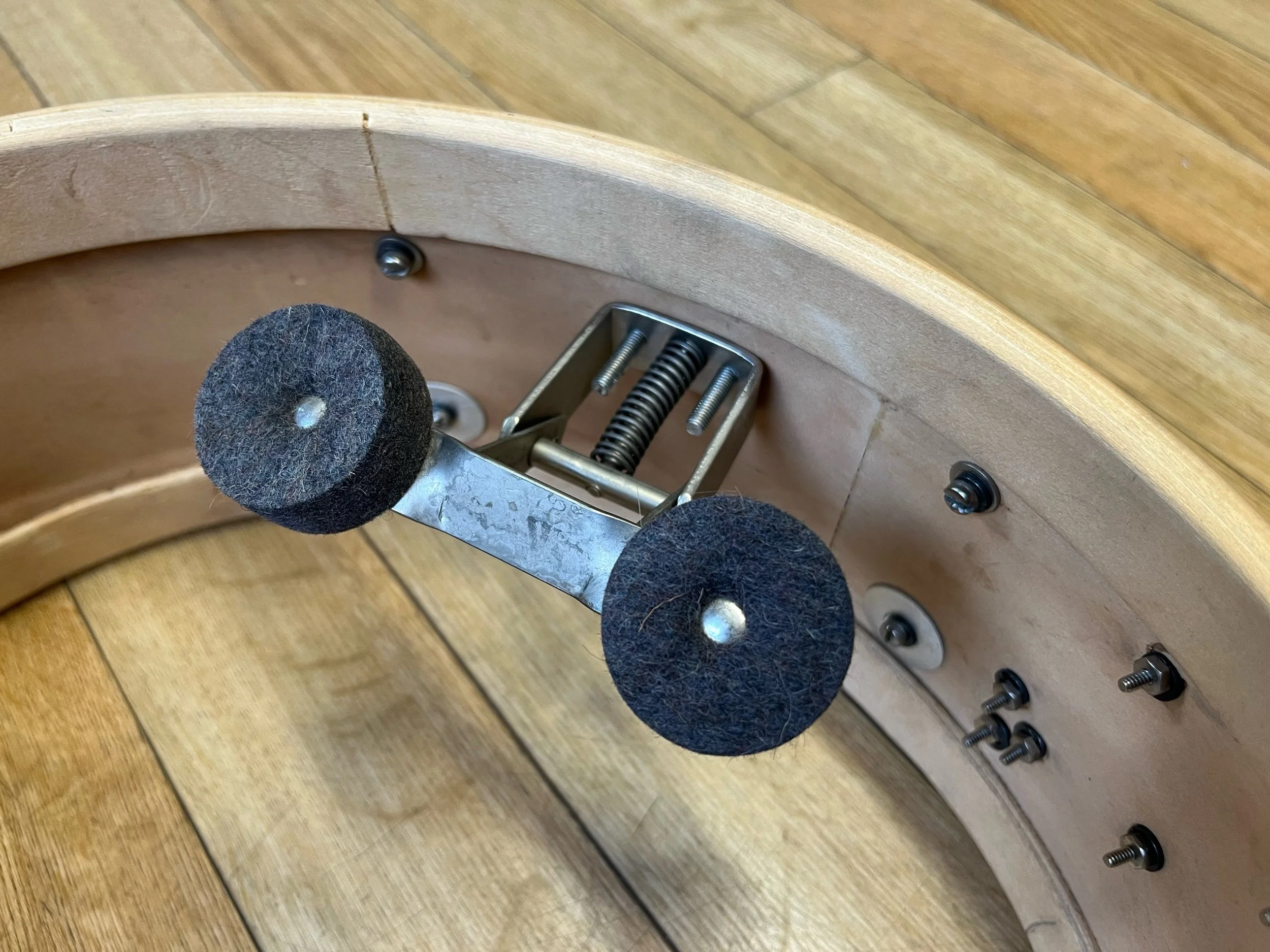 Original chrome hardware including ‘rim-shot’ brass hoops, complete 'rapid' snare strainer, tension rods, internal dampener lugs and butt end.