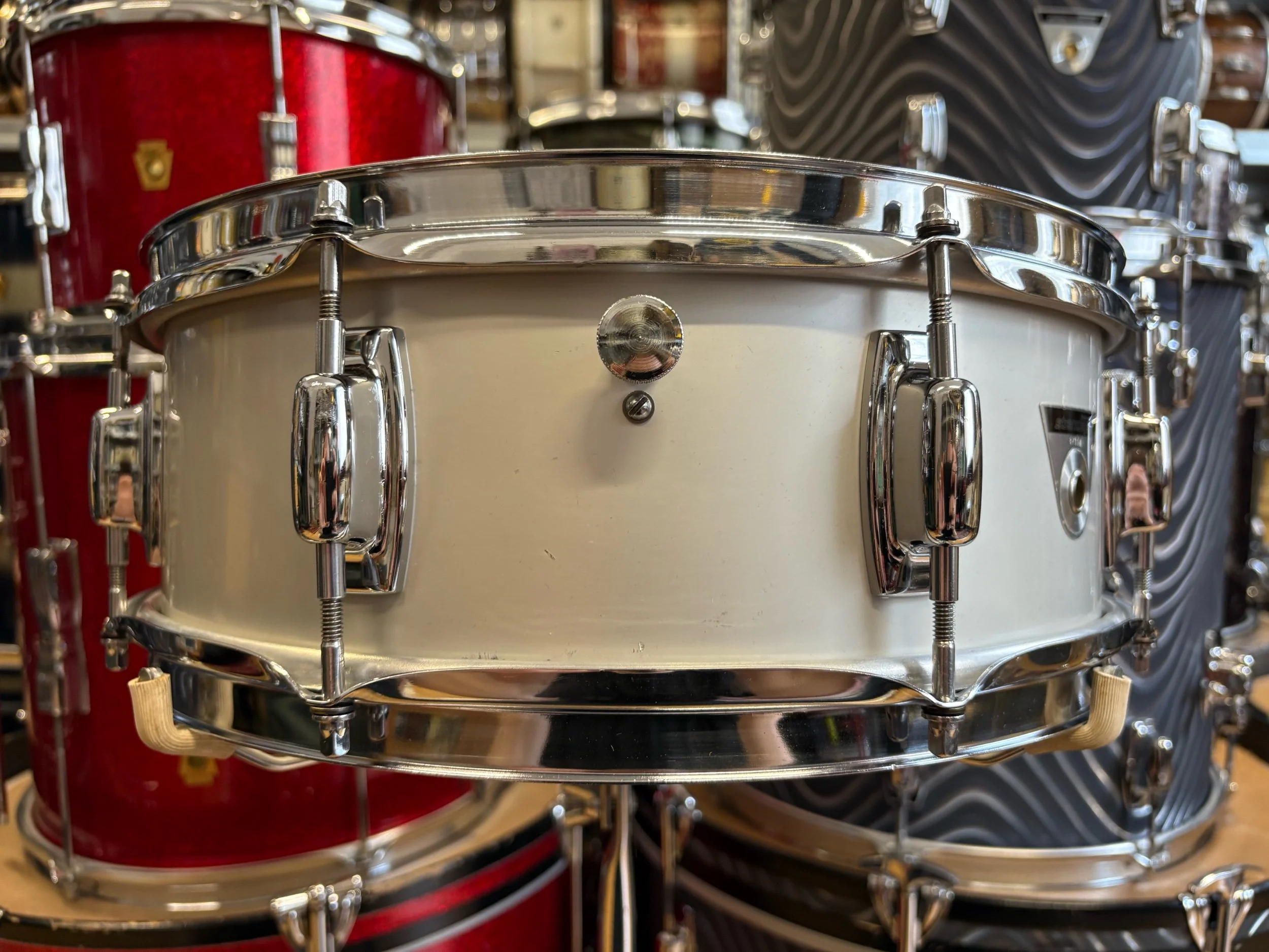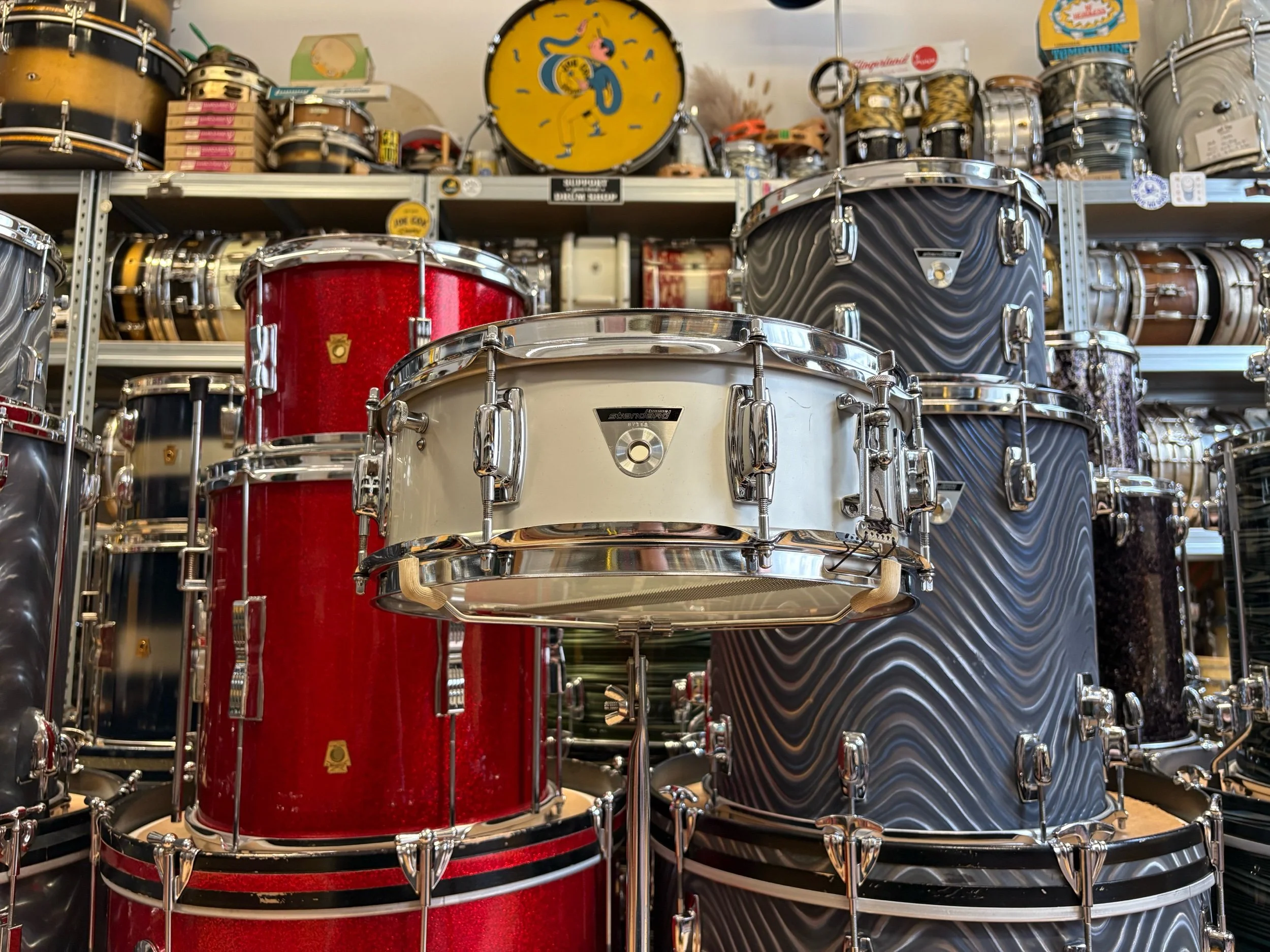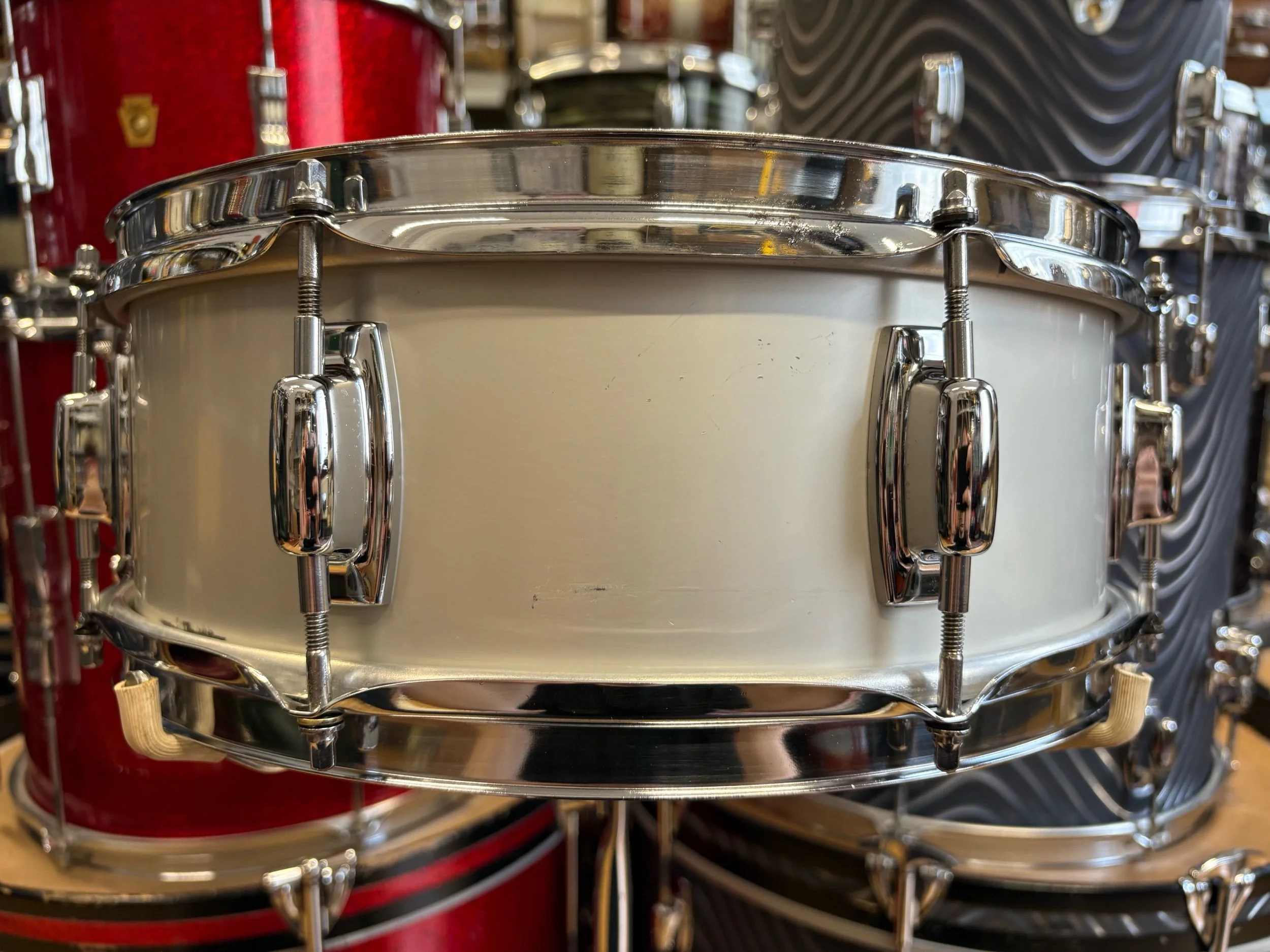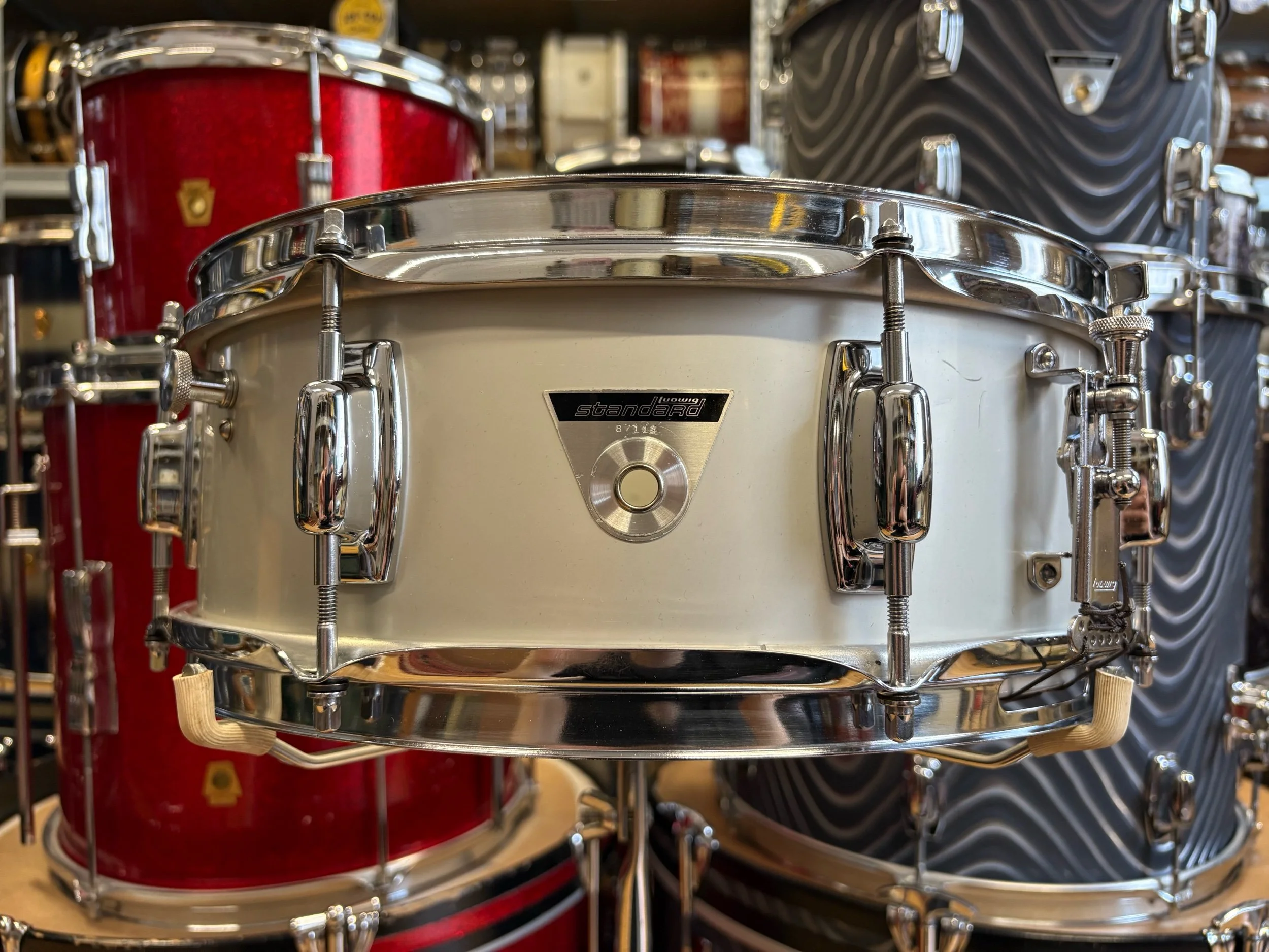 In the late 60s, the Ludwig Standard range was launched to compete with budget level Japanese ranges of the time. The two metal snare drum options in the Standard range were an aluminium 14x5" with chrome plating or with 'Acrolite' finish. This is essentially the same shell as the Acrolites but without the centre bead - some would say, without the bead it gives it more of a focused sound.