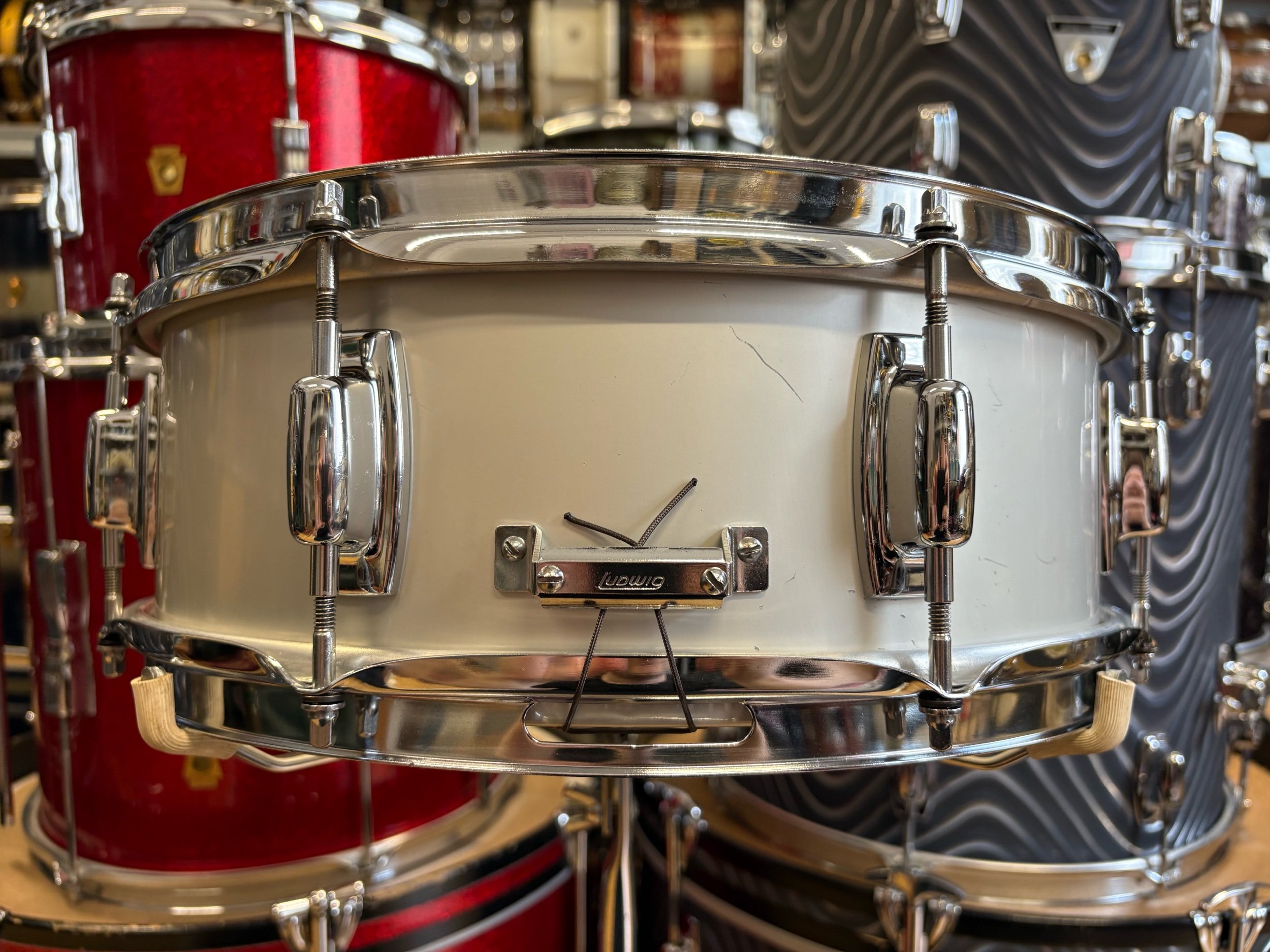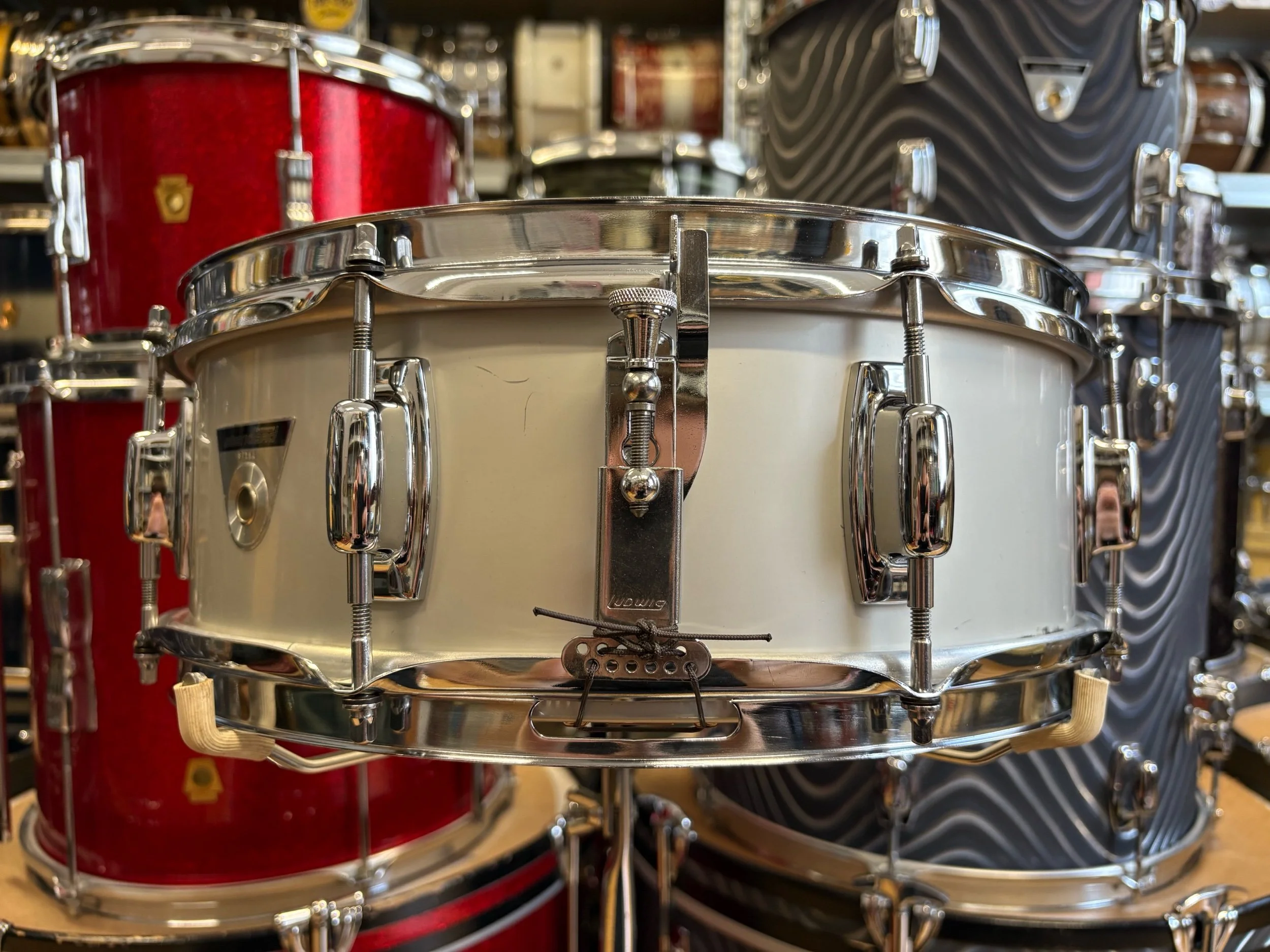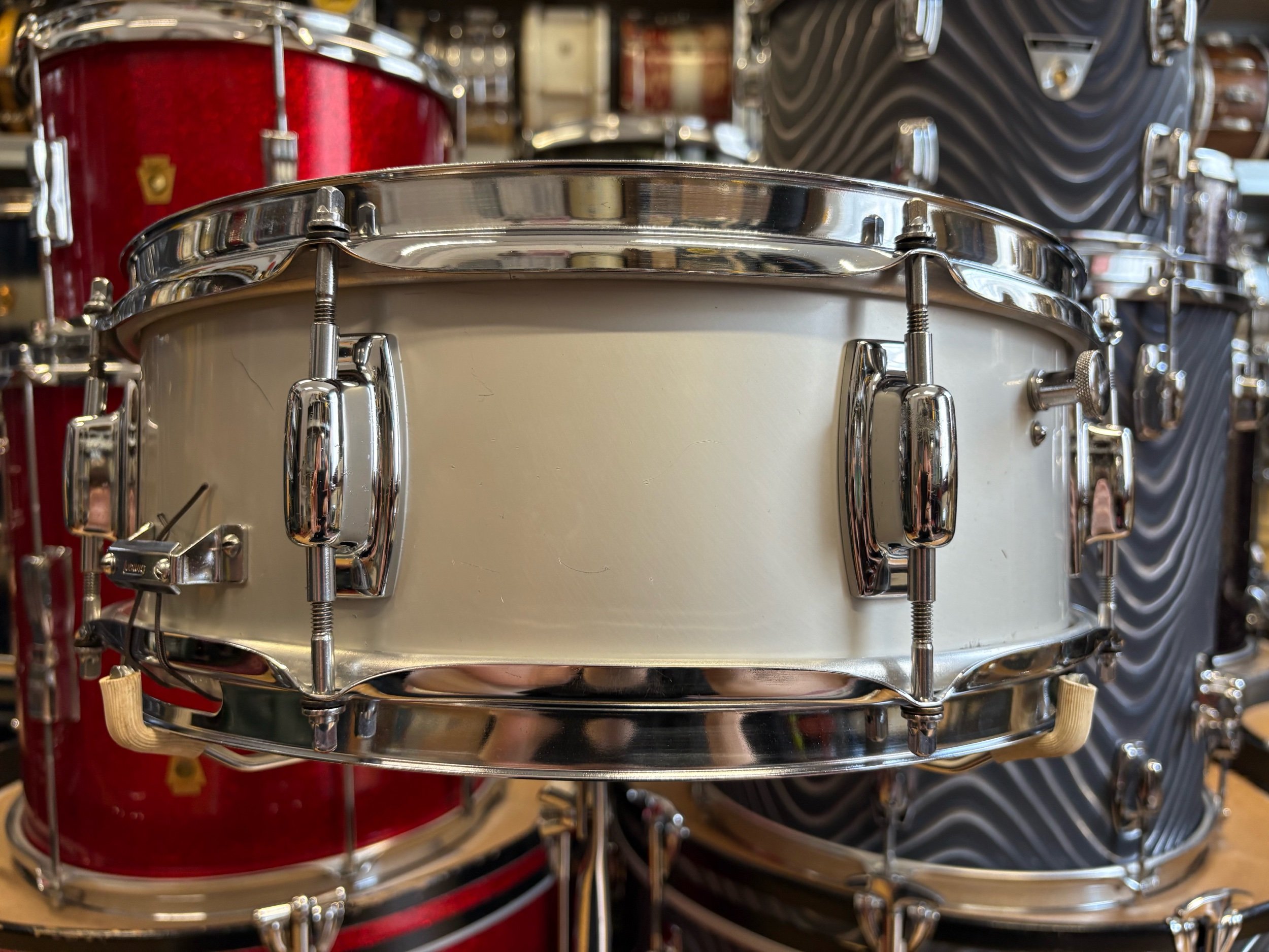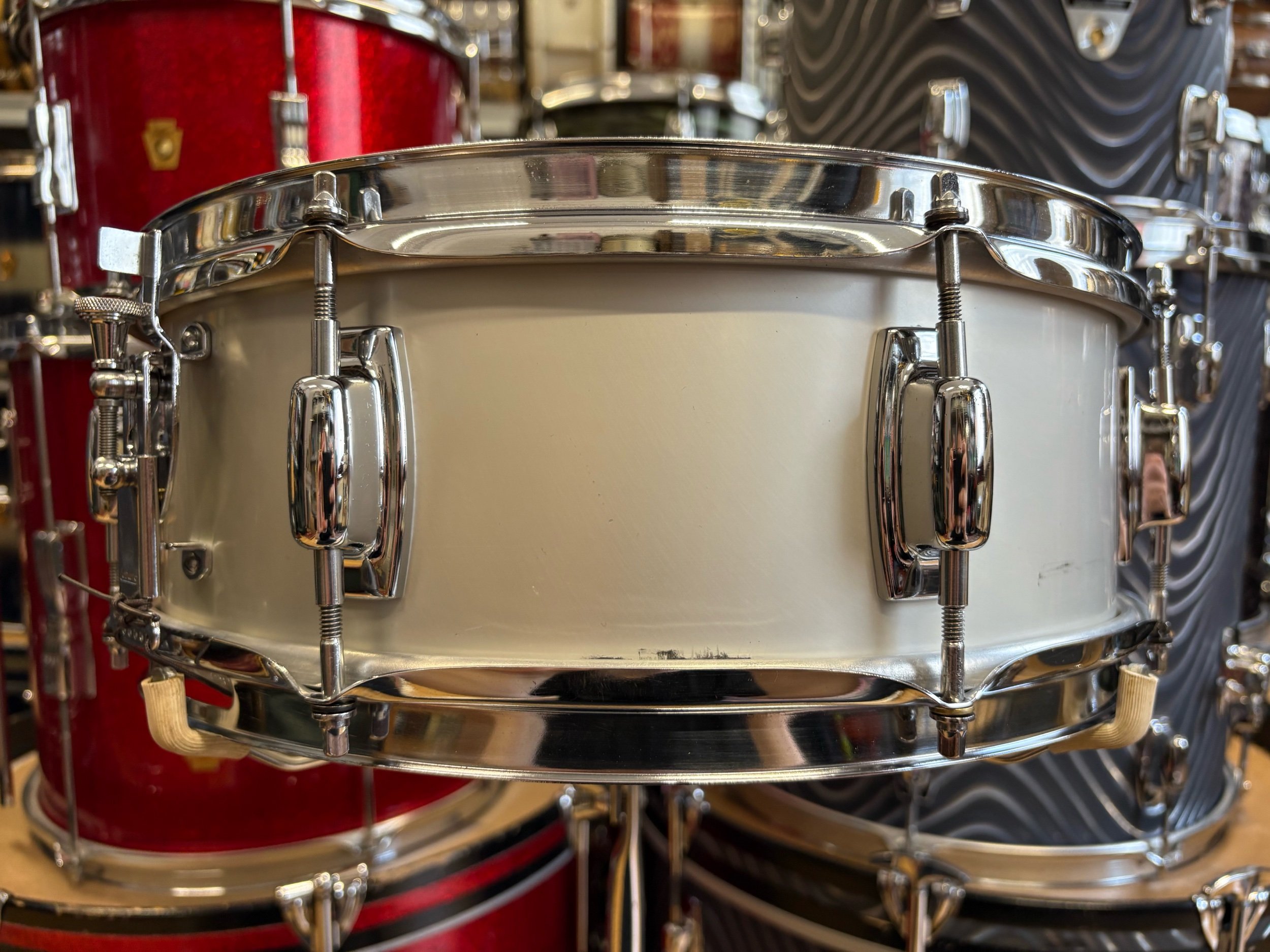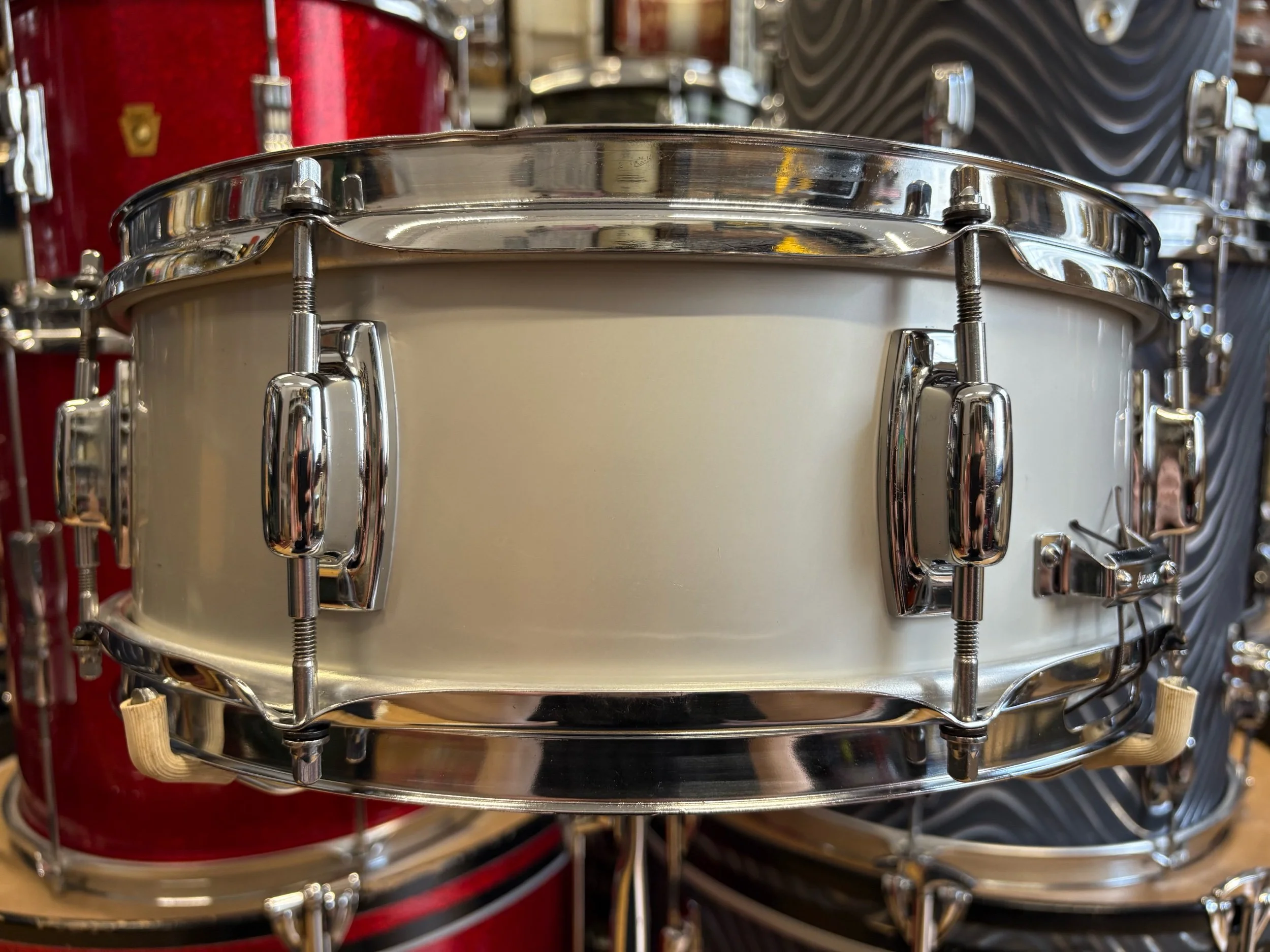 In the late 60s, the Ludwig Standard range was launched to compete with budget level Japanese ranges of the time. The two metal snare drum options in the Standard range were an aluminium 14x5" with chrome plating or with 'Acrolite' finish. This is essentially the same shell as the Acrolites but without the centre bead - some would say, without the bead it gives it more of a focused sound.