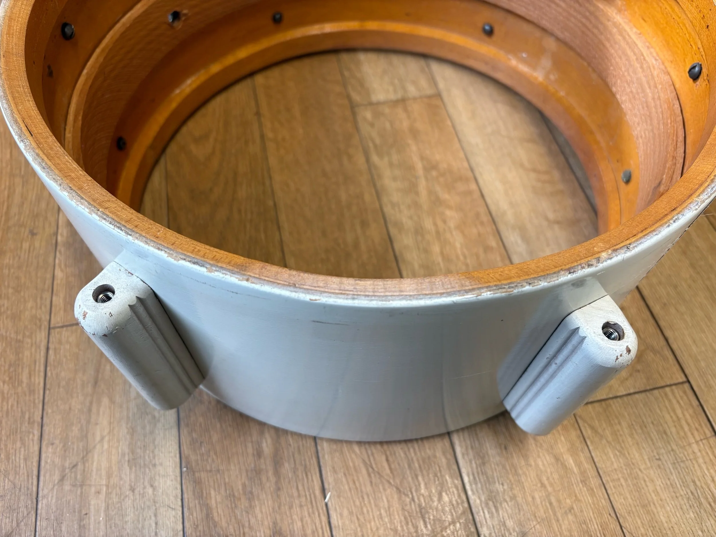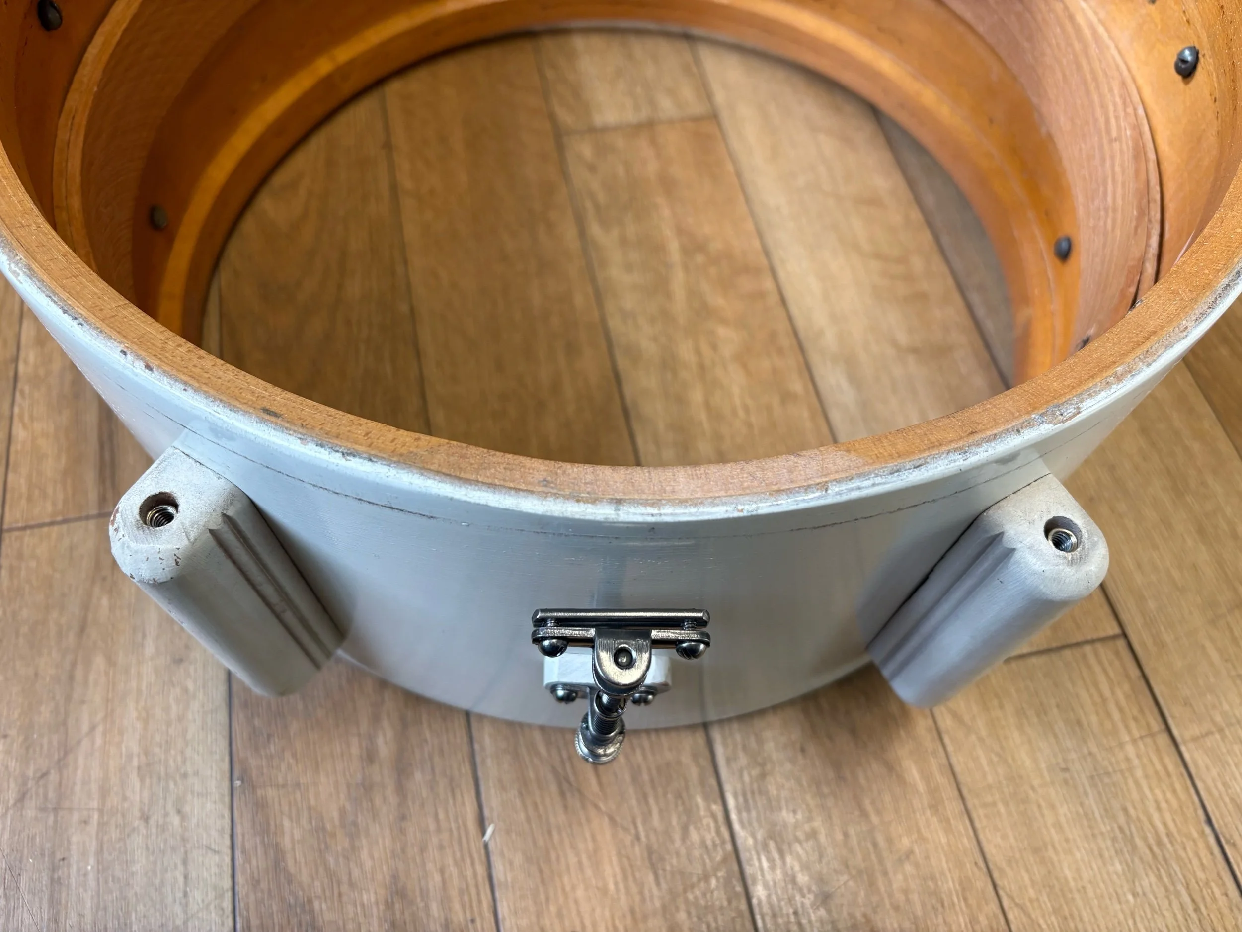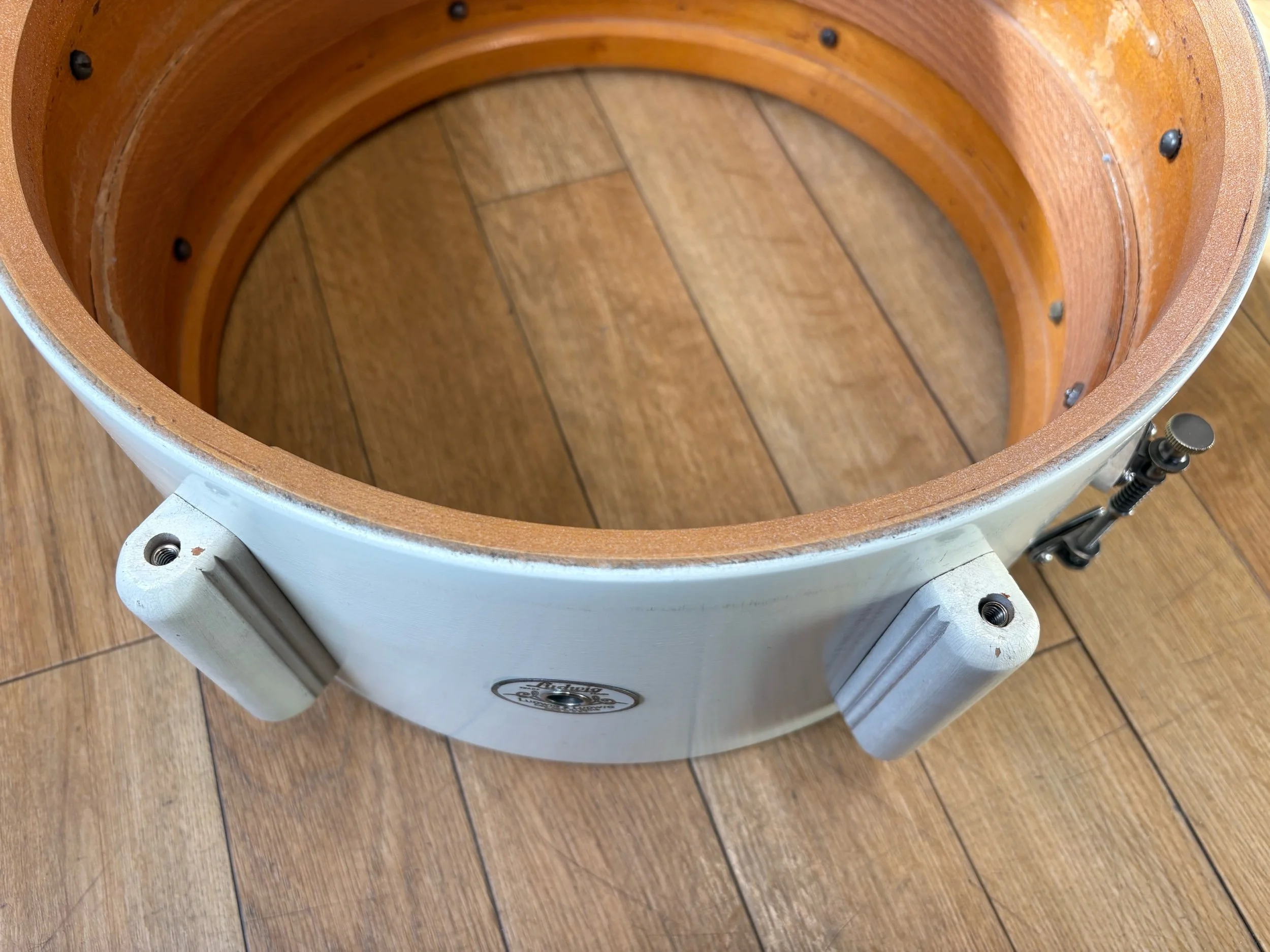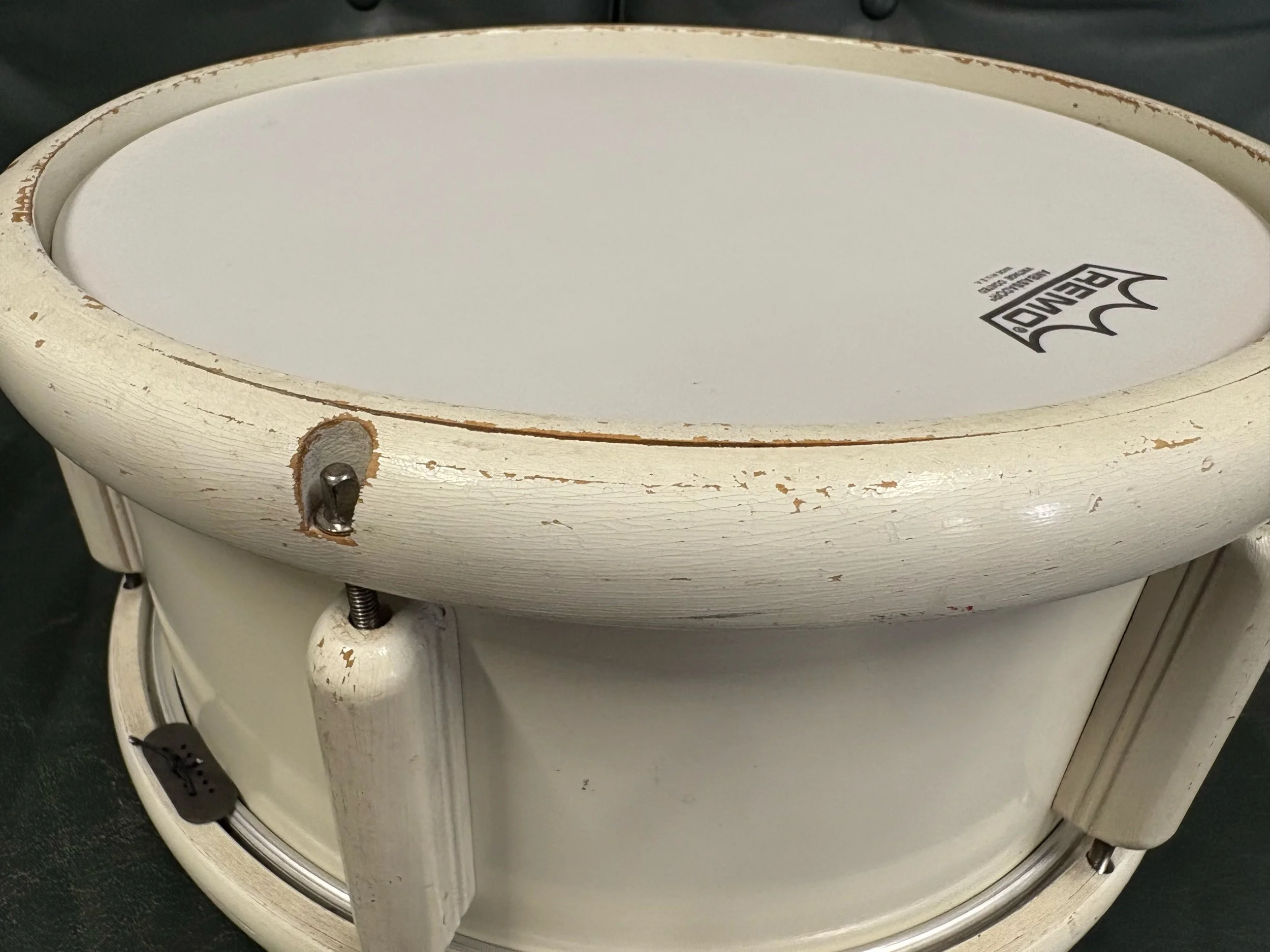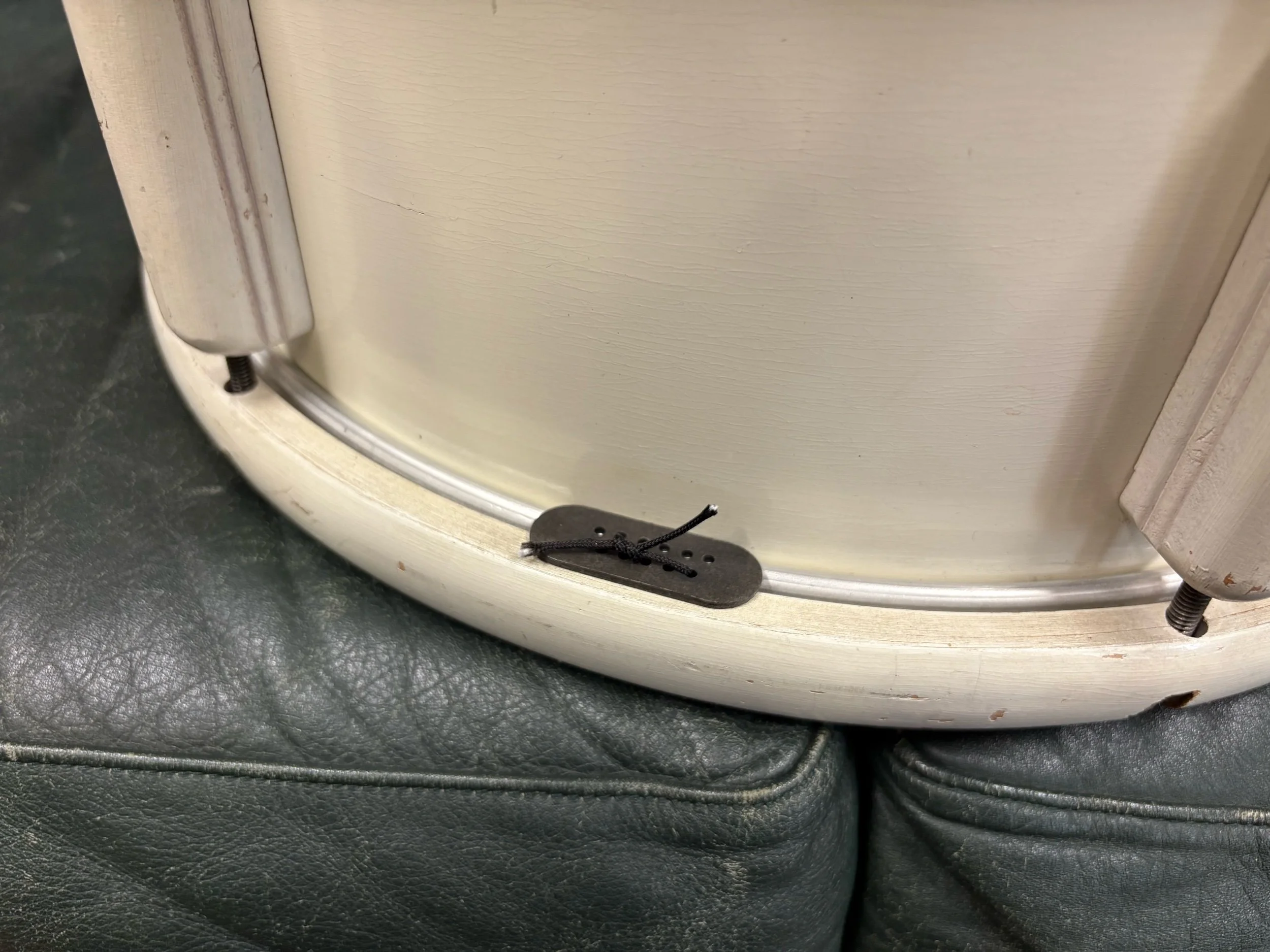 The drum is 3-ply maple shell with re-rings finished in original white lacquer which has crazed/aged beautifully with minimal aging or peeling.
