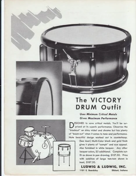 In 1942, the American war production board and US government ordered a reduction in the use of non-essential items. Newly manufactured goods such as musical instruments had to be constructed using only 10% metal. This led to the halting of production for brass and wind instruments and for drum companies, they had to quickly adapt their production. There was also lots of saving and using household metals.