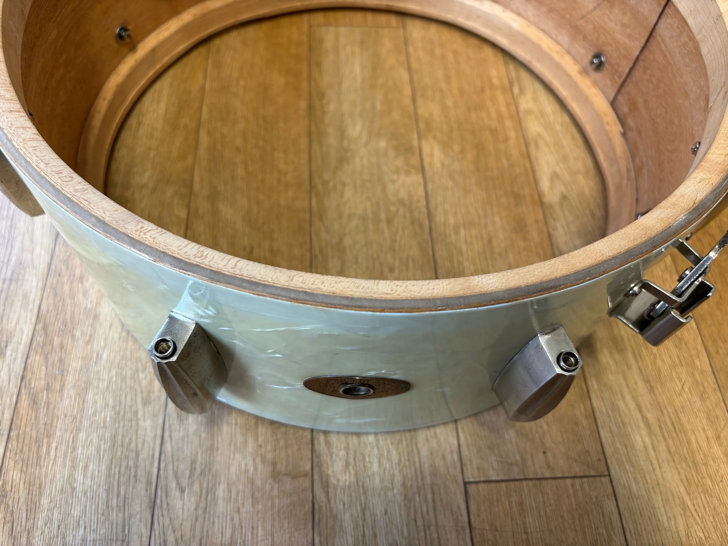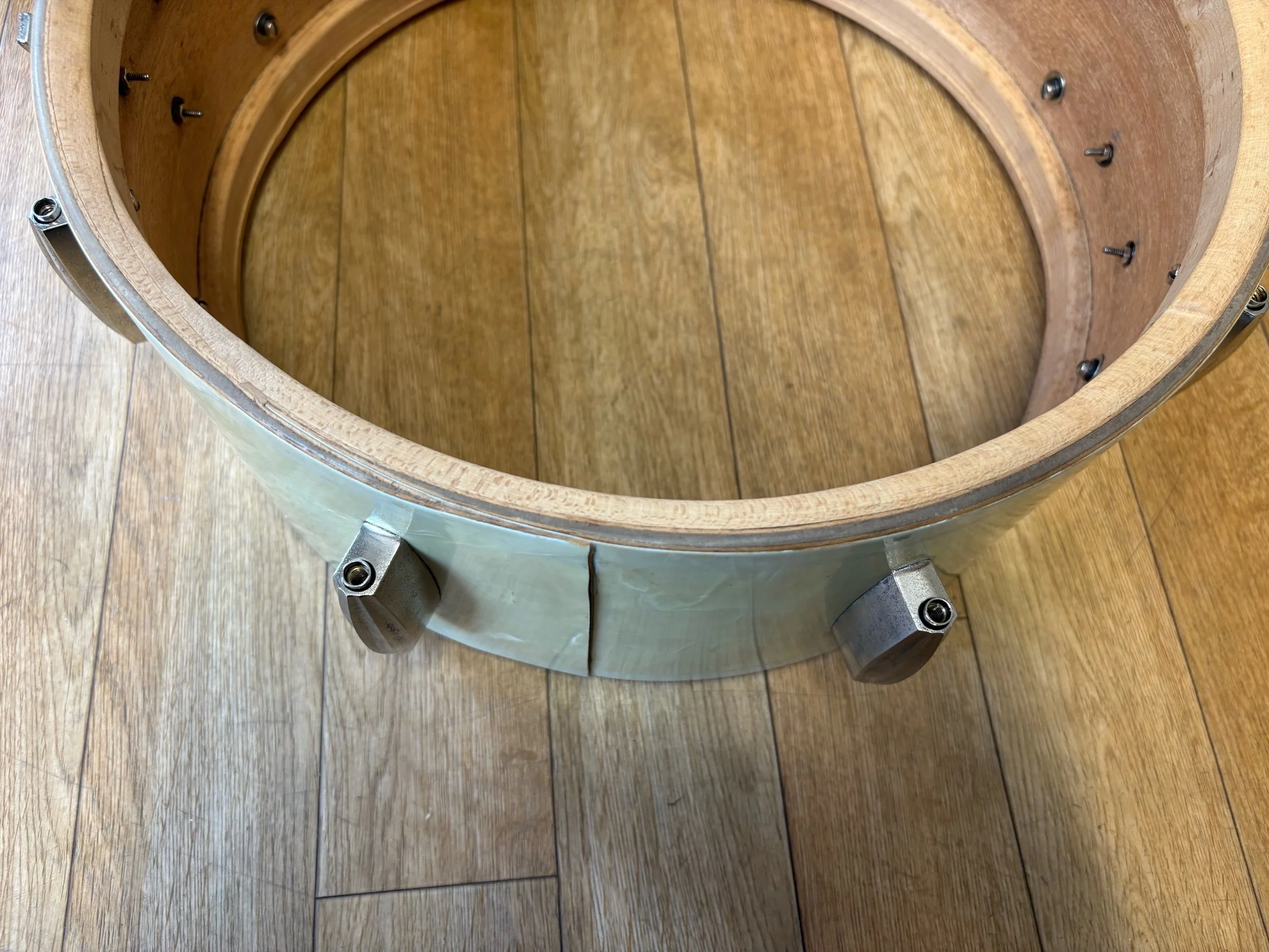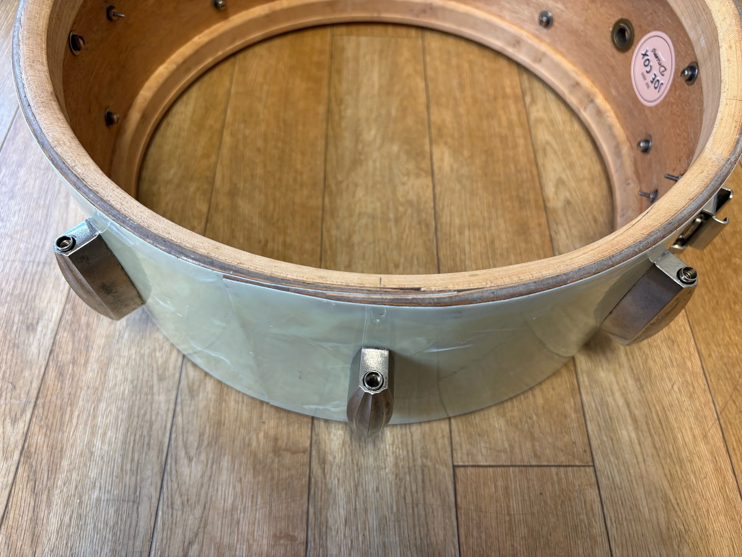 Nickel over brass hardware including original Rapid strainer with full extender piece, single flange hoops, tension rods and claws. Two hoop claws aren’t original.