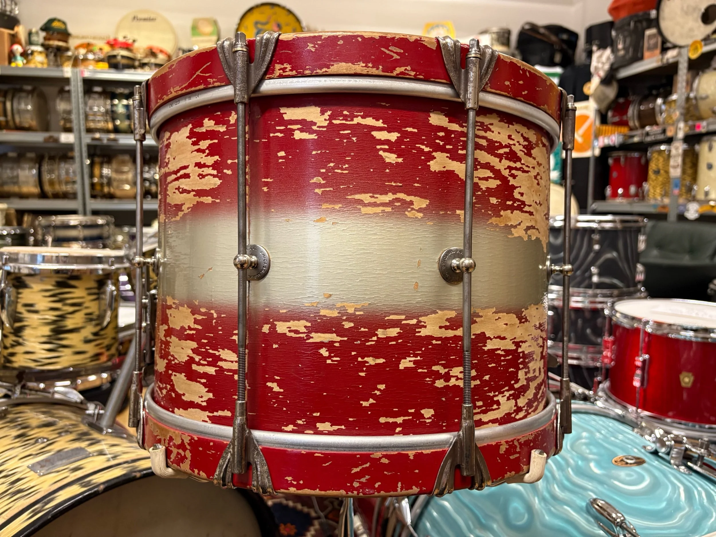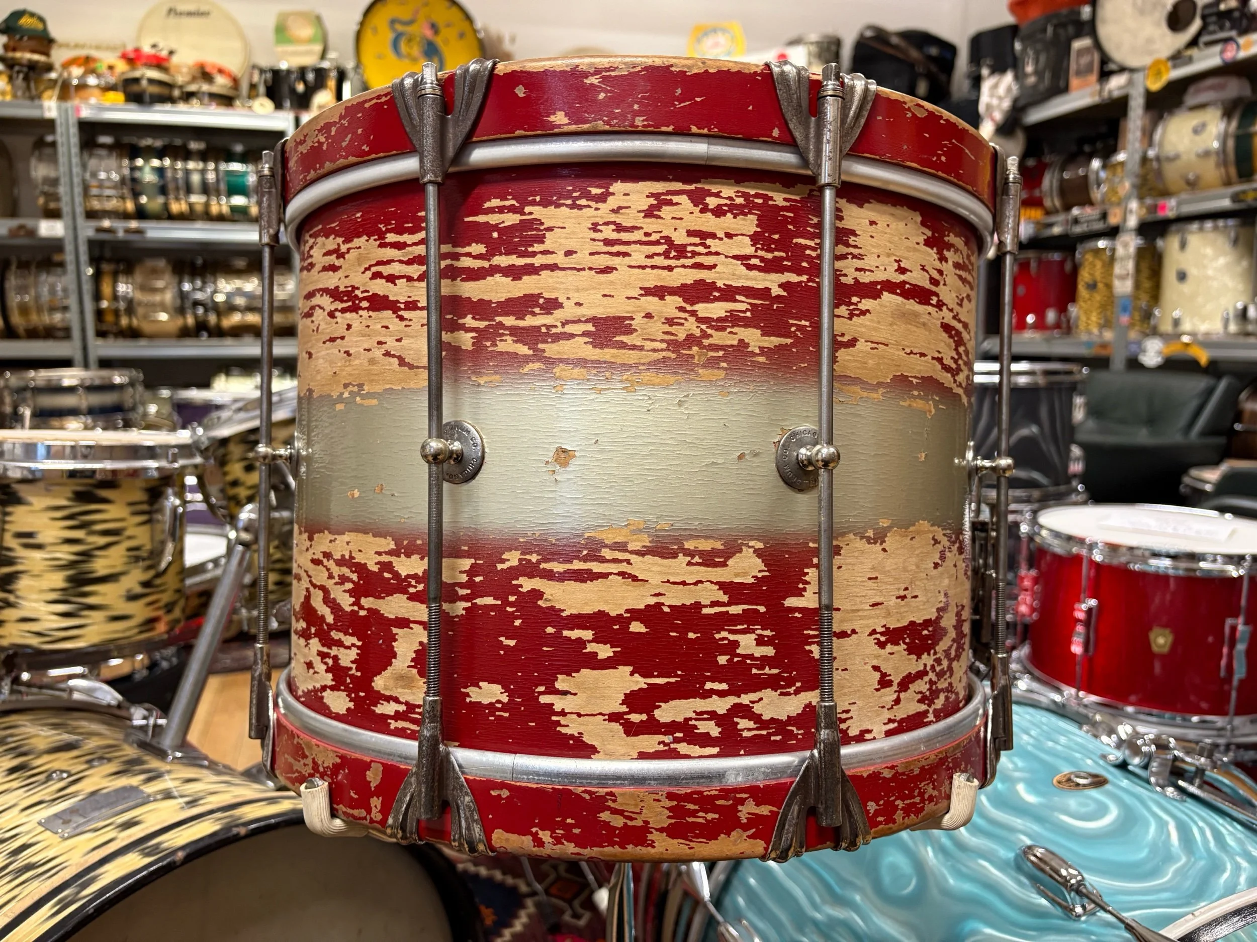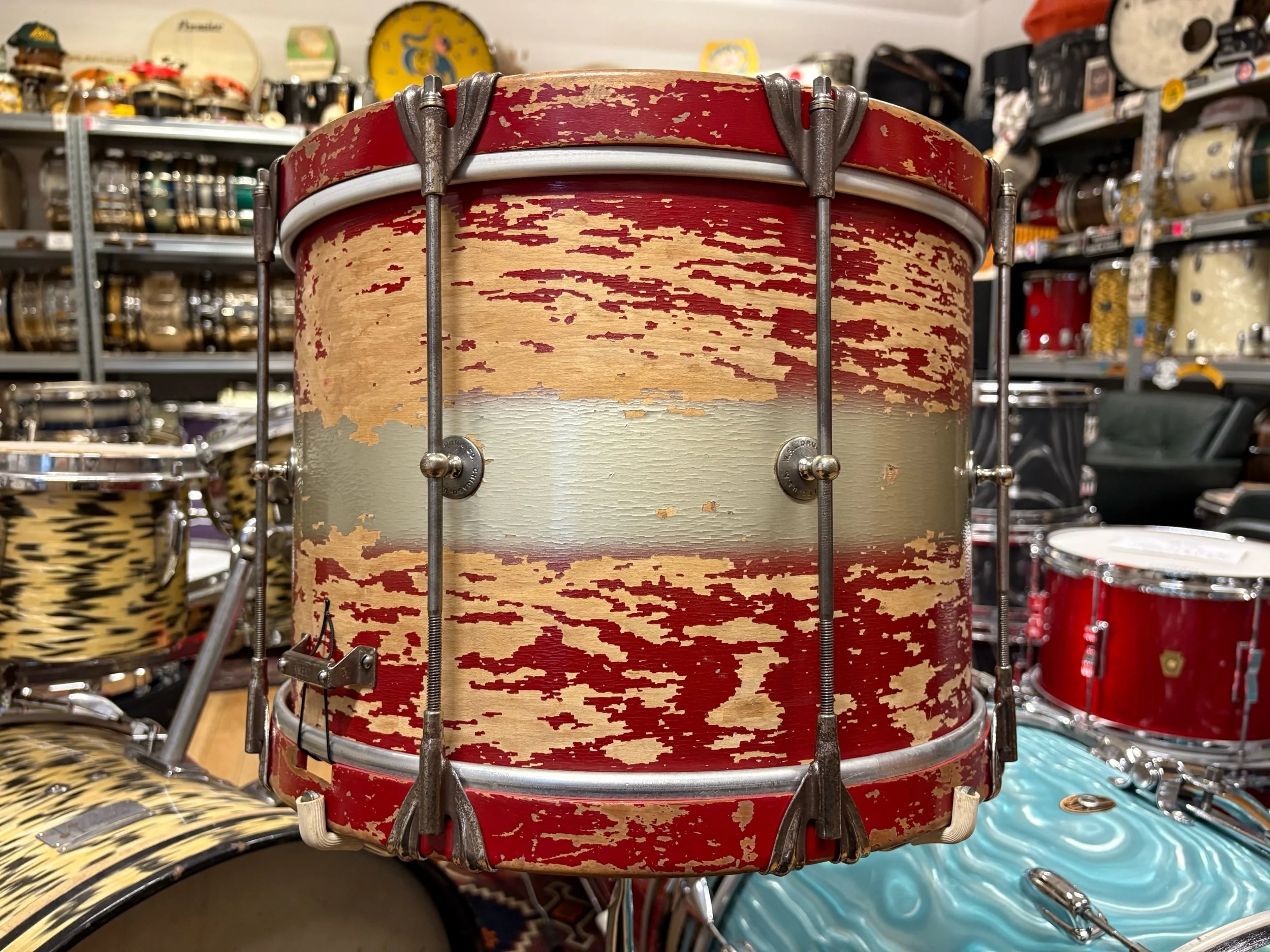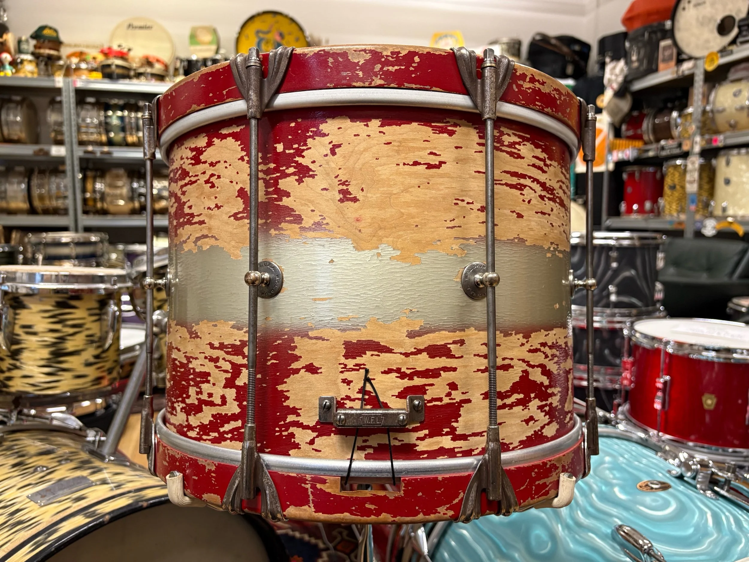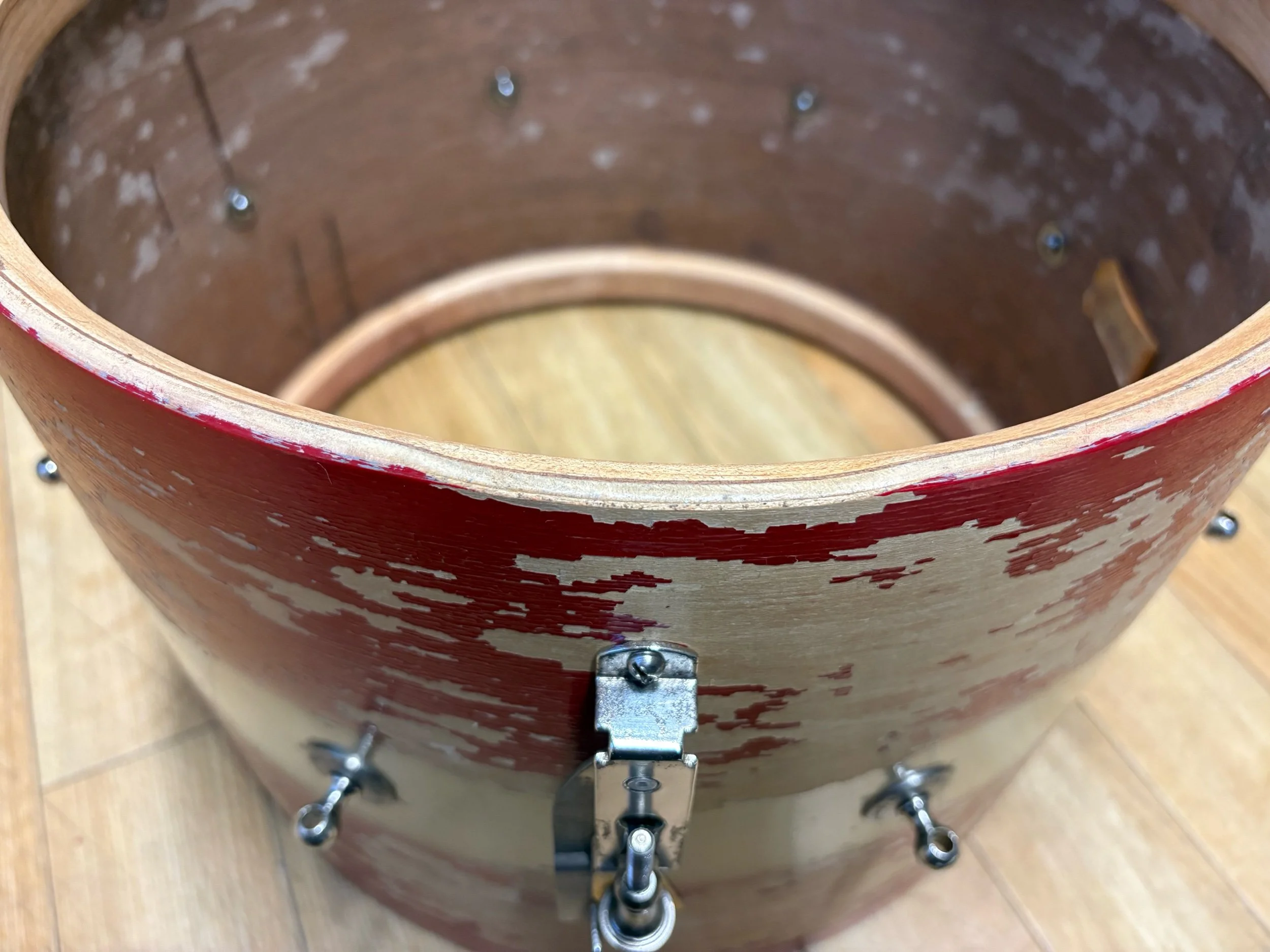 Original rare lacquer finish. These drums were often used by colleges/universities, so the finish is probably custom for their official colours.