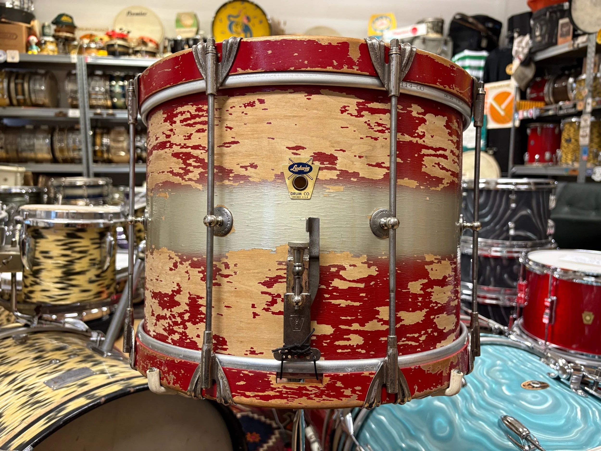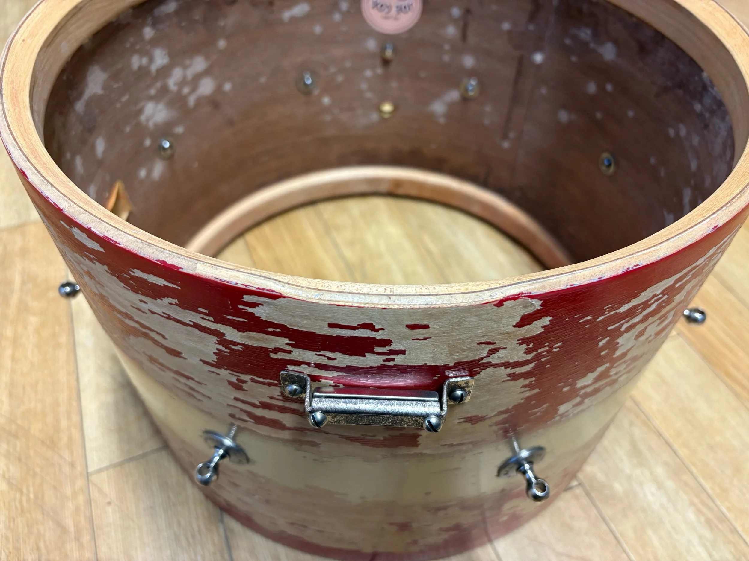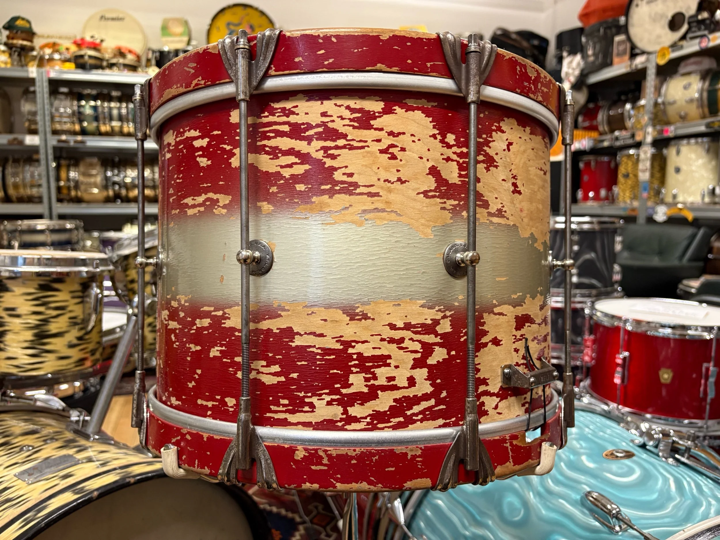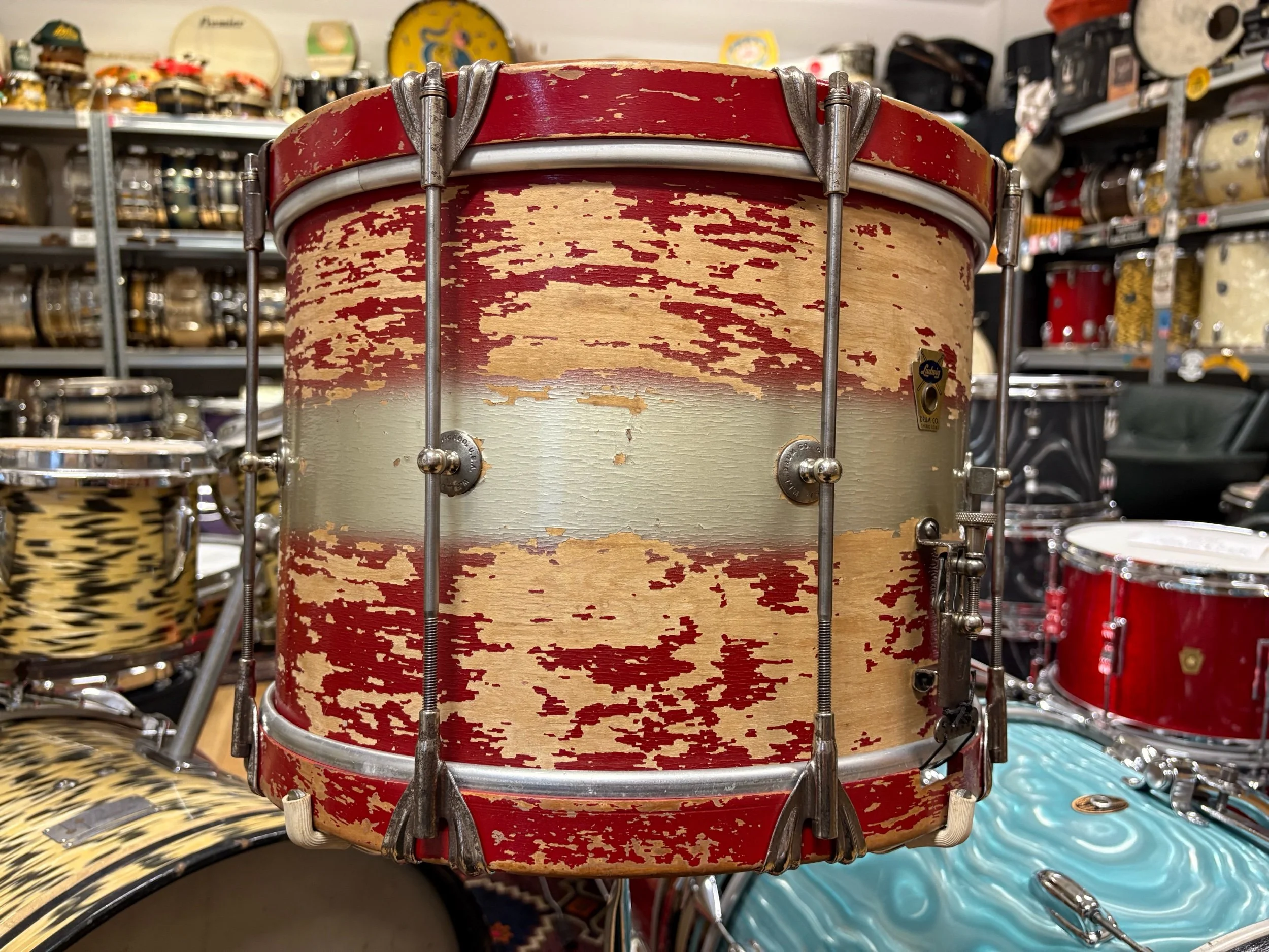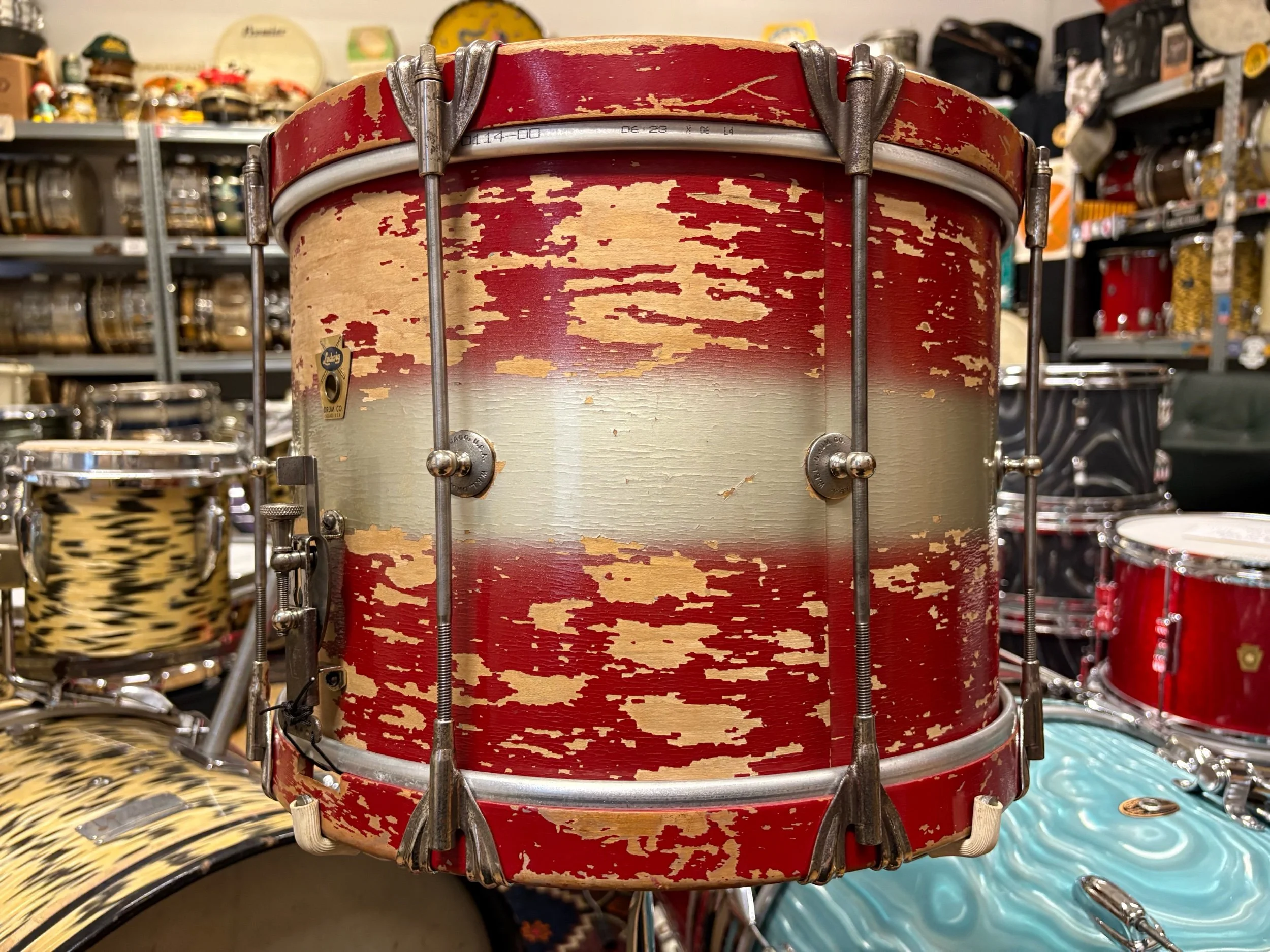 Original rare lacquer finish. These drums were often used by colleges/universities, so the finish is probably custom for their official colours.